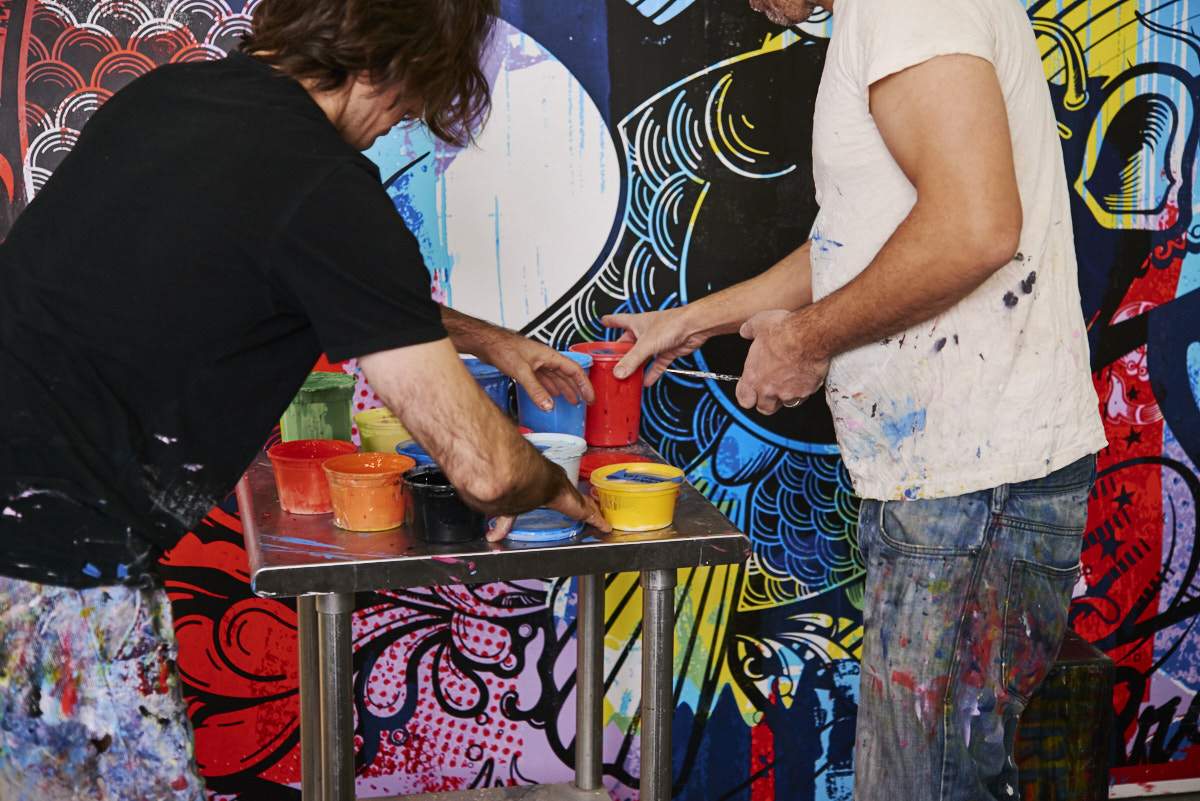 They have also collaborated with the legendary French fashion label, Agnès b., to create a limited collection of garments which sold out internationally. The team has also worked with Nike, Spike TV, Fabergé, Qualcomm, Gibson USA, and VH1. Recent large-scale works and interior installations include the Columbia College’s Wabash Arts Corridor in Chicago, The City of Basel Switzerland and the William Vale Hotel in Brooklyn, New York.