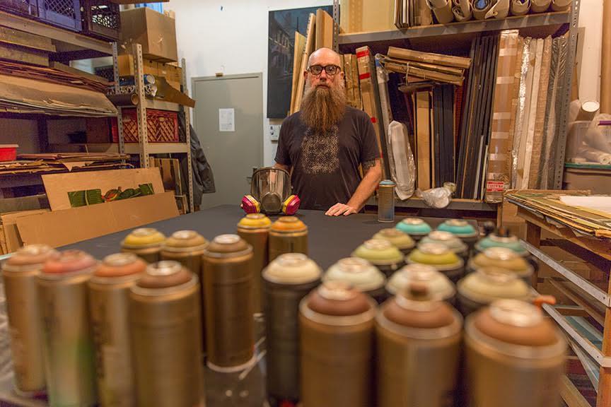 Originally a screen printer, Logan’s work has gained notoriety due to his ability to capture the sometimes mundane cycle of city life in a haunting, yet refined way with his hand-sprayed multi-layered stencils. Called a painter with a photographer’s eye, Hicks’ work has largely focused on the perception of the urban environment, at times humanizing its architectural angles and structures, and at others using its vastness to explore identity, awe, and loneliness.