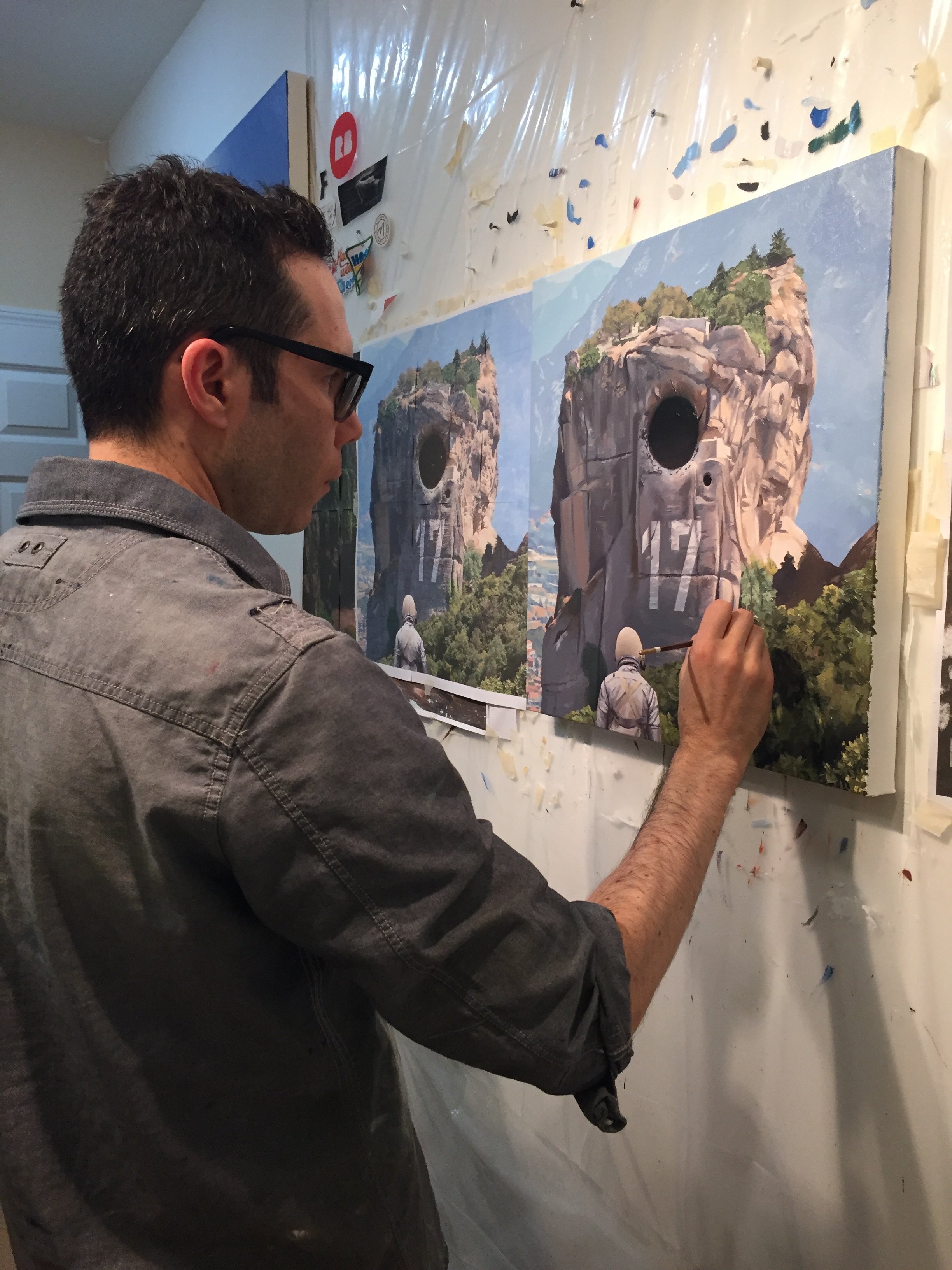 Scott Listfield is known for his paintings featuring a lone exploratory astronaut lost in a landscape cluttered with pop culture icons, corporate logos, and tongue-in-cheek science fiction references. Scott grew up in Boston, MA and studied art at Dartmouth College. After some time spent living abroad, Scott returned to America and, shortly before the real life, non-movie version of the year 2001, began painting astronauts and, sometimes, dinosaurs.