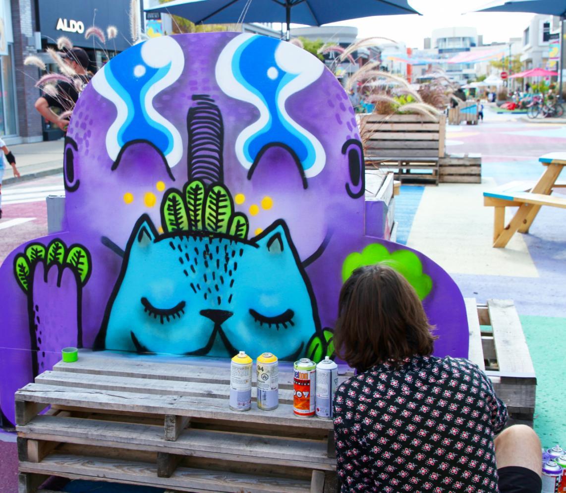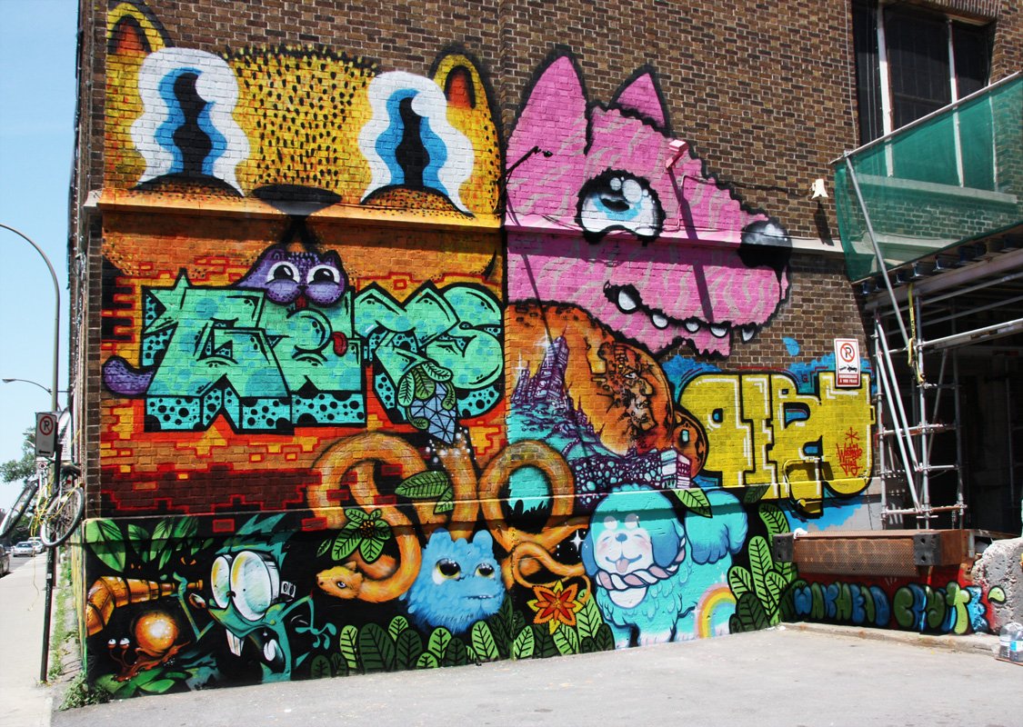 Toronto born street artist, Waxhead, has been involved in Canada’s graffiti and street art culture for almost a decade now. He moved to Montreal in 2012 to continue to develop his distinct style in the streets and in his studio. His materials range from plain old bucket paint, spray-paint and oil sticks which enable him to create brightly coloured and detailed works of art on nearly every block of the city.